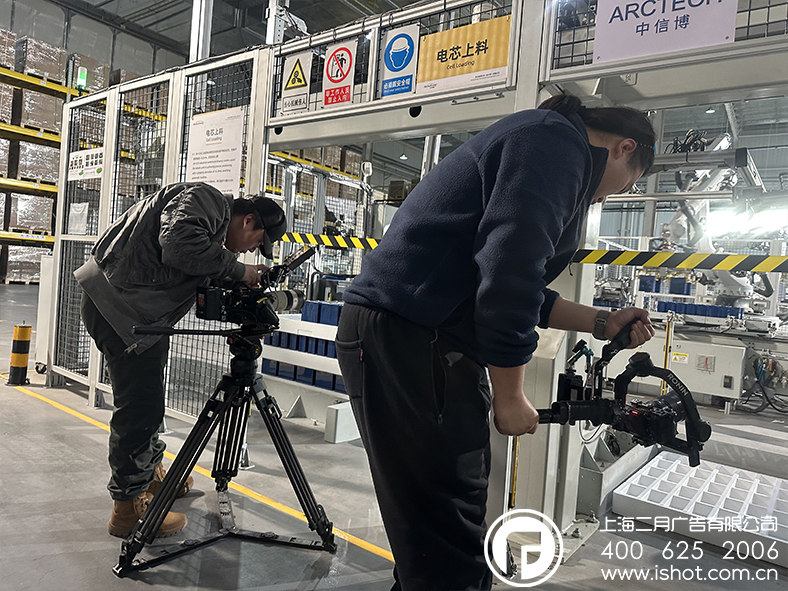 车间内,机械臂精准完成电芯上料的动作,产线有序运转。我们的摄制团队分工协作,有人用电影级摄像机捕捉特写细节,有人用稳定器跟拍动态生产流程,更有人在调试灯光,让每一处金属质感与科技细节都清晰可见。